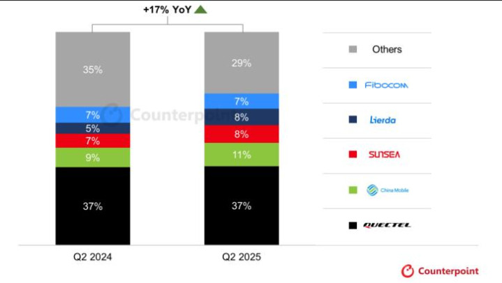 具体而言,移远通讯(Quectel)凭借在中国及外洋市集的强势份额,捏续保捏众人启航点地位。中国出动位居第二,受益于运营商驱动的国内需求。日海智能(SIMCom + Longsung)位列第三,主要由 POS 和智能仪容的出货推动。立尔达(Lierda)排在第四,同比增长 73%,依托 Cat-1 bis 时刻以及在韩国和东南亚的普及率升迁。