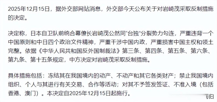 中国此次的反应,至极速即,也至极明确,咱们有一部法律叫《反异邦制裁法》,故意用来拼凑那些干预咱们内务、毁伤咱们利益的异邦东说念主和组织,此次,法律条规被再次激活,精确地落在了这位日本前高官身上。