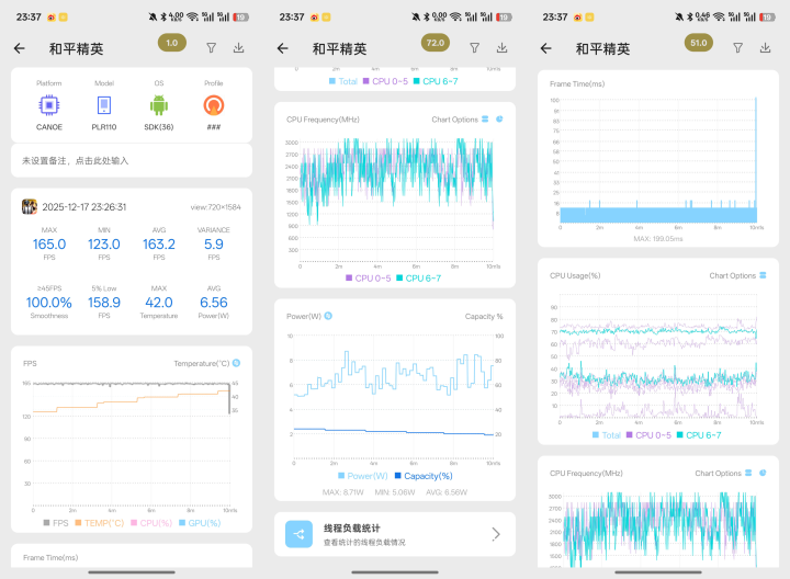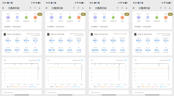在《三角洲行径》连续游戏期间大致1小时,在树立165帧步地之后,一局游戏平均帧率达到163帧以上,LOW帧因为每局都不小心挂了是以终末有下落未几作念证据……从最高帧和全体帧率弧线相称稳固。需要证据的是,开启165帧步地后画质会放胆为“流通”,天然不像一加15可以开启到良好,关联词165帧带来的极致流通感比画质细节更能影响赢输,不是么?