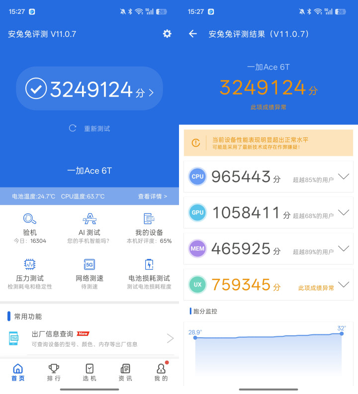我们先通过跑分数据直不雅感受其性能实力。在常温环境下,安兔兔评测跑分冲破324万分,我问过别东谈主也有跑328万的、以致有能跑到330万以上的……这个收成至少与骁龙8至尊版持平,对比某些调度一般的机型以致还能“遥遥最初”一下子。至于上头的UX分数(用户体验评价,模拟用户使用)特地,莫不是ColorOS16过于丝滑,连安兔兔都嗅觉不可想议?
