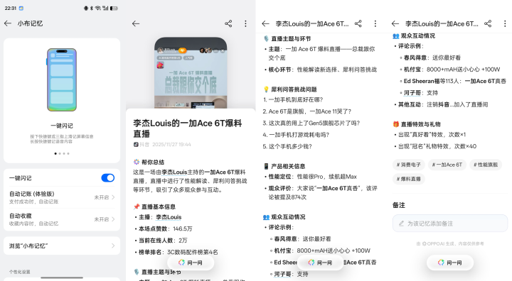 小布哀悼功能(可树立AI键开启一键闪记),不仅是“截图”那么轻视,也不单是可以“哀悼”笔墨内容,以致连直播都可以去分析哀悼,并索要回想直播内容,简直便是一个只喝电不收钱的小布告~