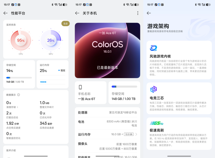 性能是一加Ace 6T的中枢竞争力,亦然其“性能旗舰”定位的底气方位。骁龙8 Gen 5聘用与第五代骁龙8至尊版同源的第三代Oryon CPU架构,Adreno GPU亦然最新一代架构,而当作首发机型,一加Ace 6T可以说是奏凯就把价钱“打下来”,让后发的友商机型稍许纷扰(贵了1K+)……至于LPDDR5X Ultra内存与UFS 4.1闪存的黄金组合,以及风驰游戏内核、灵犀触控芯和G2电竞会聚芯片构成的“三芯电竞系统”,可以说奏凯将它的性能提高到同档天花板。