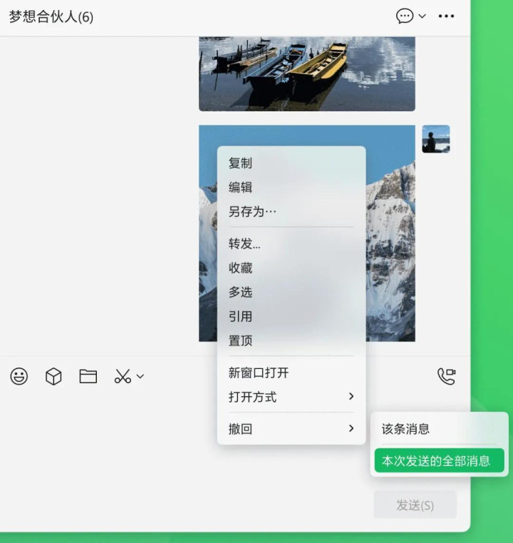 在聊天中一次性发送了多个图片/视频/文档等音书,不详转发了多条音书到聊天中后,需要裁撤时,现增多了“裁撤本次发送的总共音书”的新选项。